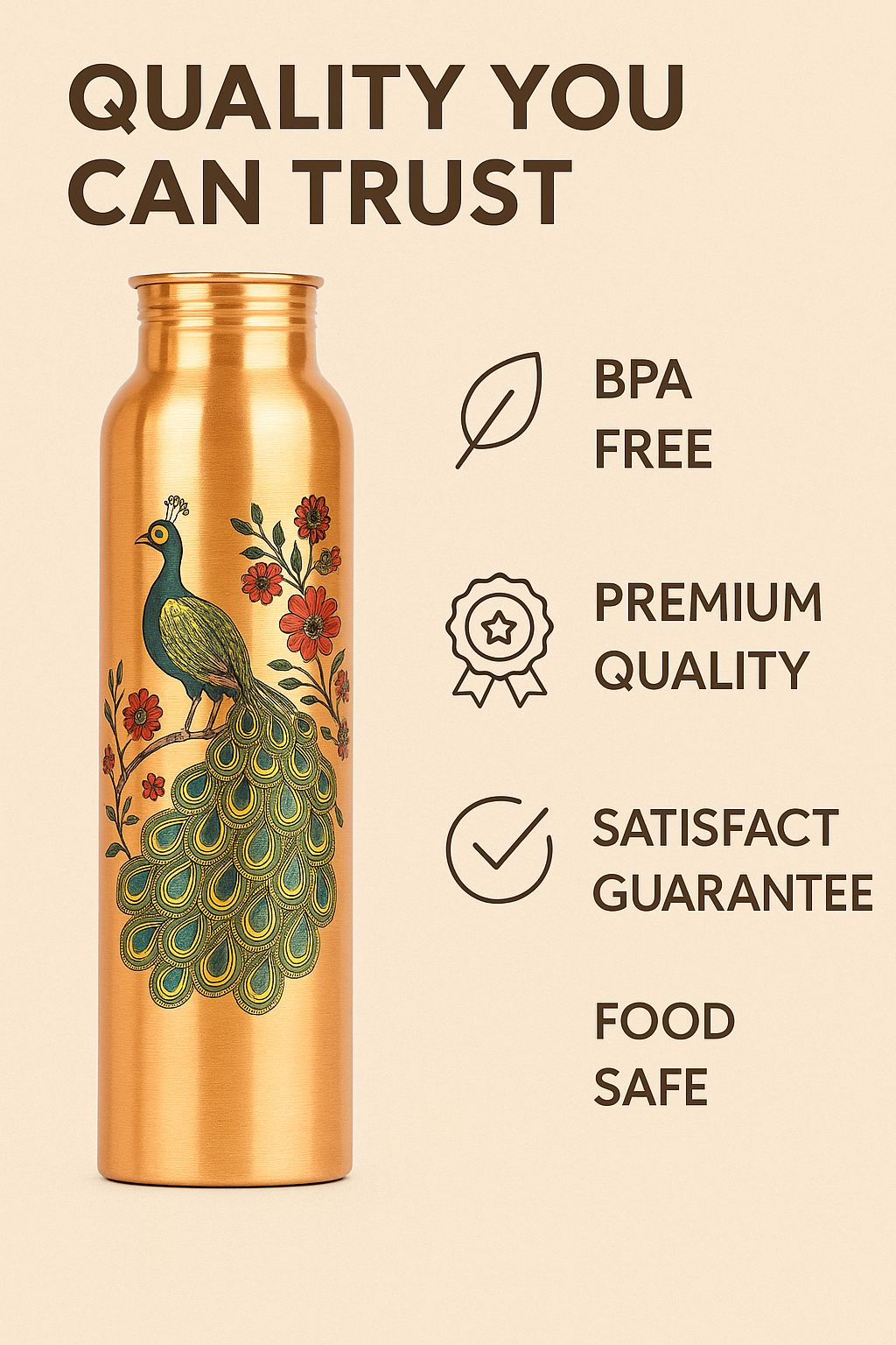 Handcrafted from 100% pure copper, this 950ml bottle features a beautifully engraved peacock design, symbolizing grace and purity. Infused with Ayurvedic wisdom, this bottle not only keeps your water fresh but also boosts immunity, digestion, and skin health naturally.